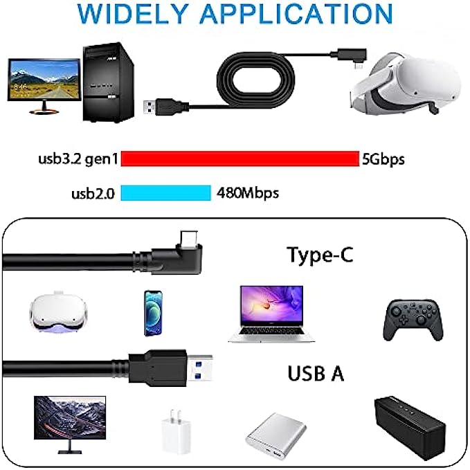 • HIGH SPEED DATA TRANSFER: The charger connects to VR PC games, compatible with USB 3.0/3.1 Gen1/3.2 Gen1, supports data transfer speed up to 5 Gbps, and conducts without delay(USB3.1/3.2 ports guarantee 5 Gbps data transfer). Make it quick and easy to connect to the Link program, enhancing your gaming experience.