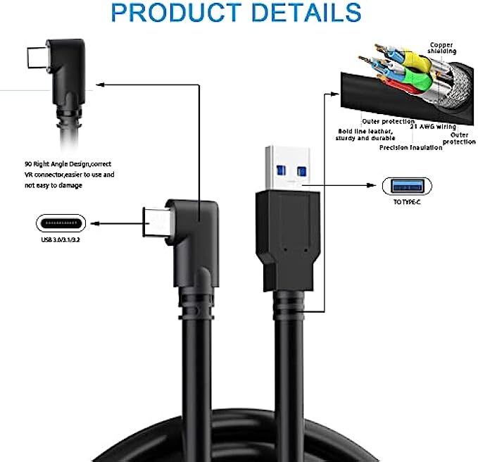 • LINK CABLE: 16-foot long charger, L-shaped design, not easy to fall off, allowing you to move freely without restriction while playing games. 90° right angle, preventing disconnection, more stable, giving you an immersive VR gaming experience. usb 3 to usb c to pc, up to 3A to charge while in use, saving charging time.