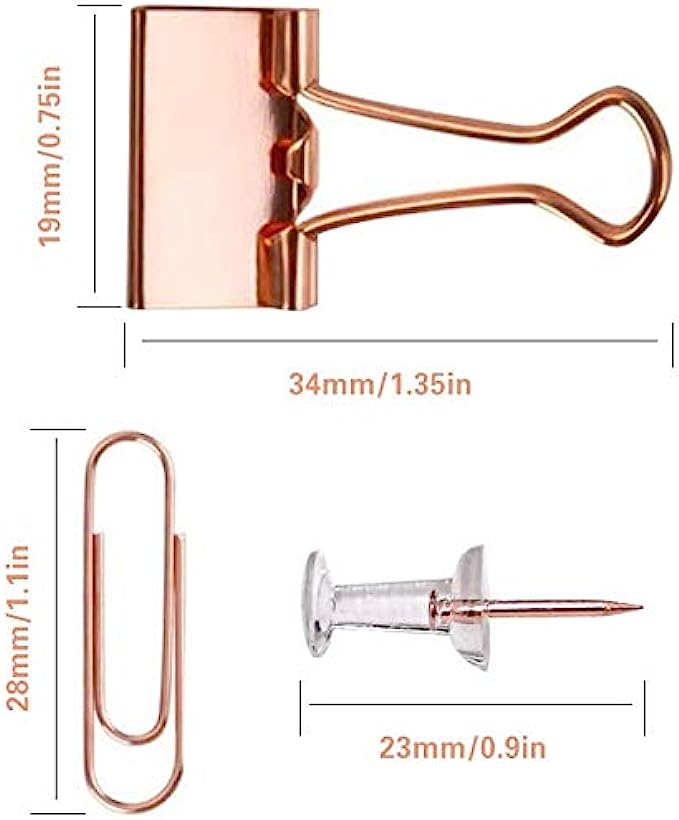 • 【Rose Gold Stylish】 This set includes rose gold push pins,paper clips and binder clips. The luxury rose gold color wichin is a new fashion will make your office sleek, modern, and confident.