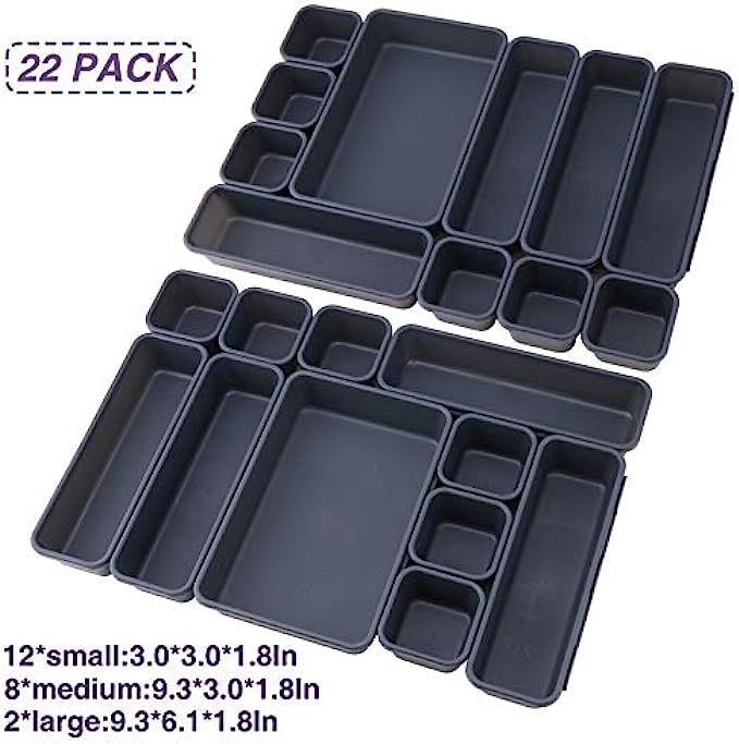 22 Pack Desk Drawer Organizers,Interlocking Junk Drawer Organizers and Storage with 3 Sizes,Desk Drawer Tray Organizer for Office,Bathroom,Kitchen,Makeup(Dark Grey)