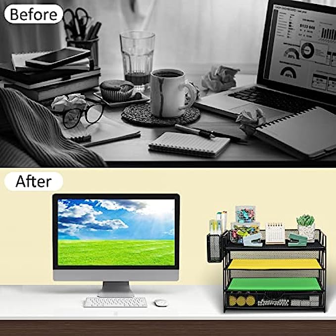 • 【Super Large Capacity】4 tier desk organizers and storage is ideal for your office, it has enough storage space for all your office desk supplies can sort your files, paper, which is very convenient for you to find the files you need. This paper letter tray design hanging pencil holder (with built-in hooks) has two to organize all your pens and pencils, the sliding drawer can be placed at will and provides great space for your desktop.