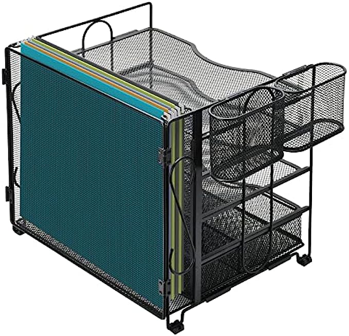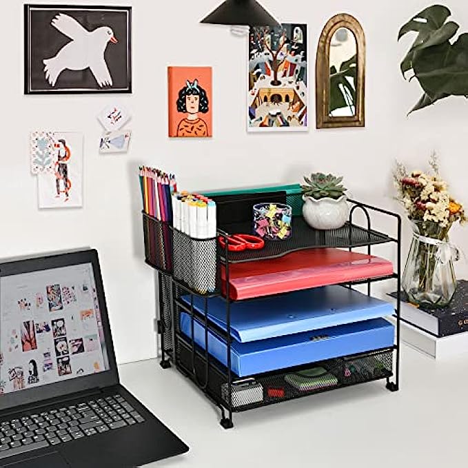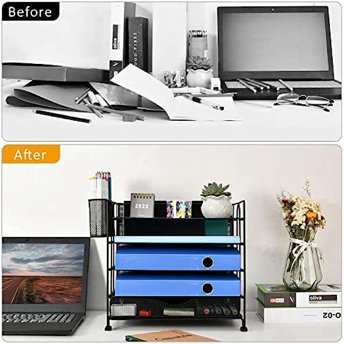 • 【New Upgraded Design】Unique 5 Tier paper shelves design and one vertical file storage layer on the back, with 1 extra sliding drawer and 2 extra pen holders (can be hung on or use separately) , totally an all-in-one desk organizer.