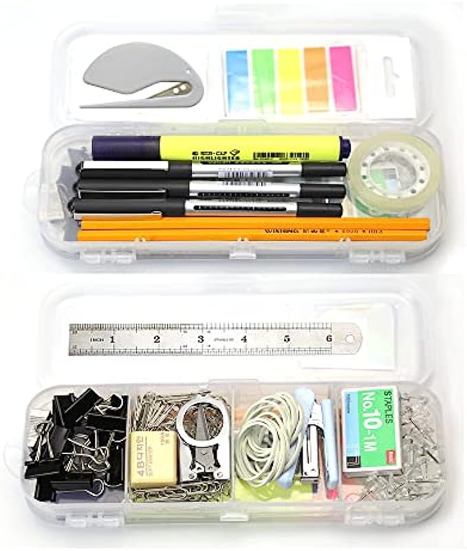 ALL IN ONE OFFICE KIT: you will find all the common office supplies from this little box, includs Binder Clips*12, Sharpener*1, Paper Clip*80, Stapler*1, Staples*1000, Rubber Band*12, Eraser*1, Clear Push Pin*18, Letter Opener*1, Page Marker*5, Steel Ruler*1, Pencil*2, Highlighter*1, Black Pens*3, Steel Scissor*1, Clear Tape*1,Clear Pencil Box* 1