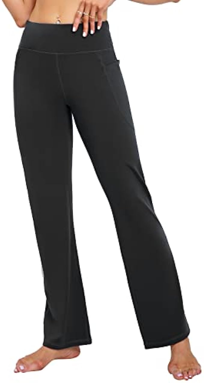 73% polyester 27% spandex ULTRA-SOFT MATERIAL: Bootcut workout pants(Upgrade) for women are made from materials with 73% Polyester & 27% Spandex premium butter. Super stretchy and soft, large proportion polyester retains its shape and is very durable, easily washed & dried. HIGH WAIST & TUMMY CONTROL: Yoga pants a High-Rise Waistband with Tummy Control design, it won't roll down even you do a wide range of movement, 4-way Stretch material that promotes both compression and support. Sweat-wicking, Non-See-Through and make streamlined look. Perfect womens dress pants. FUNCTIONAL THREE POCKETS: The bootleg pants with 2 side pockets & 1 waistband pockets are ideal for keeping your cards, keys, etc. while you're on the yoga or working out at any places. 2 side deep pockets can fit a large smart phone can let you move, squat or do any poses in your exercises. UNIQUE DESIGN: Design your own work pants that suit you best, whether you’re tall or petite, slim or plus-size or anyother. You can alter these yoga pants to your preferred inseam length all on your own; find two symmetrical marks at the bottom of the flare pants and trim. Don't worry, they won't lose their bootcut shape in the process. VERSATILE SCENES: If you're looking for even more cozy pieces for your closet, workout pants would be your Best Choice either for work, casual or daily wear, yoga pants for women can be matched from high heels to flat shoes, from office to yoga classroom, so that both your work, life and exercise can be connected seamlessly.