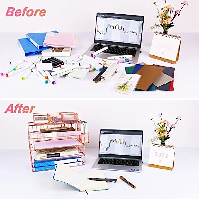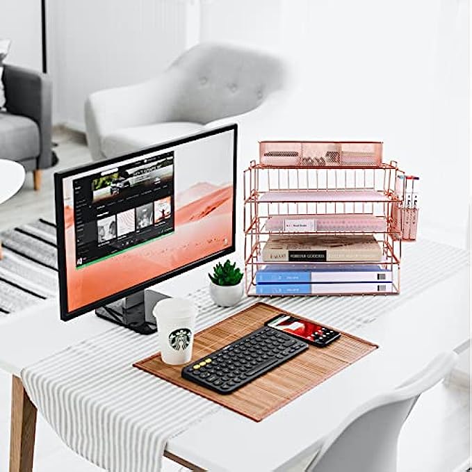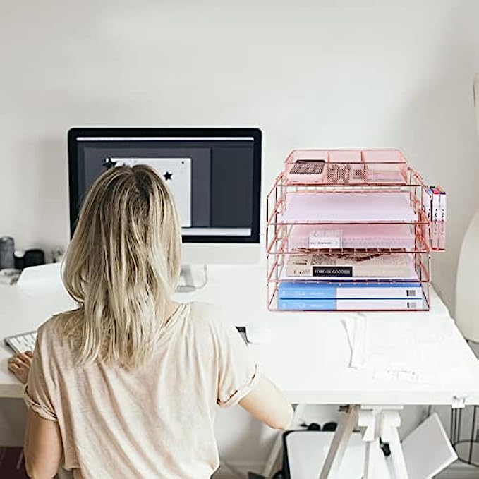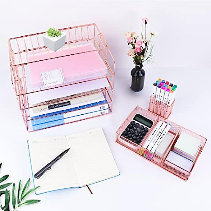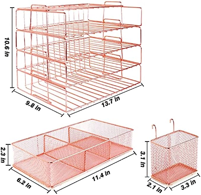 • 【PRETTY ROSE GOLD DESKTOP ORGANIZER】 Gorgeous rose gold desk organizer, includes stackable 4 tier trays, 3 compartment mesh storage tray, pen holder. Perfect for holding Letter/A4 size paper, folders, stationary, mails desk accessories.