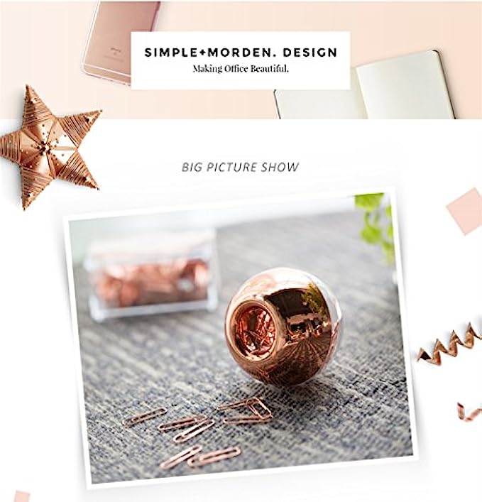 Rose gold paper clips in round paper clip holder with magnetic lid, simple + modern design, making office beautiful