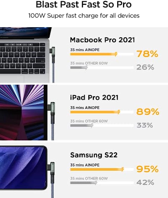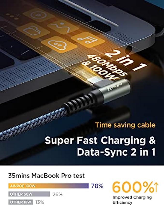 • ?2022 Upgrade 100W E-Mark Chip, 6X Faster : 100W super fast charging usb c cable to usb c is built in the best power delivery Certified E-Mark dual chip, which turbo charge supports USB PD fast charging and provides comprehensive protection to devices battery and adapters, keeping you in light-speed charging and safe. AINOPE is born for safe and fast charging. Please note: This 100W USB C cable data transfer needs to pass through the USB 2.0 USB C port.