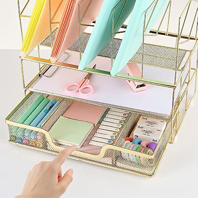 【Space Saving】The double tray with sliding drawer and vertical sorters provide everything you need and makes the most of your vertical and horizontal space. Keep your desk looking tidy at all times.