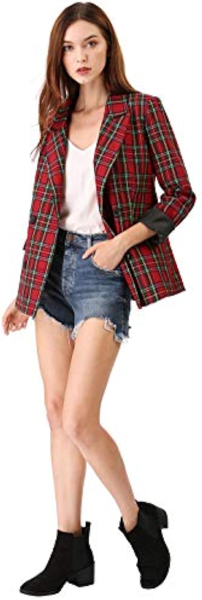 100% Polyester Double Breasted closure Machine Wash Notched Lapel Collar, Front Flap Pockets, Double Breasted Closure, Long Sleeves Padded Shoulder, Back Vent, Vintage Plaid Pattern, Fully Lined Go with midi skirts or skinny jeans suitable for work or casual everyday Occasions: Christmas Party, Office, Work, Meetings, College, Formal Ceremony, School, Casual, etc. Machine Wash with Like Color. Model is wearing in size XS (Height: 5'7", Chest: 32 1/4 inches, Waist: 24 3/8 inches, Hip: 33 7/8 inches, Weight: 99 1/4 lbs)
