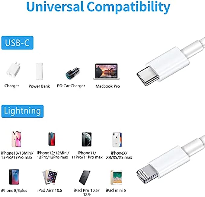 • 【PD Fast Charging and Data Transfer】Ximytec USB-C to lightning cables support power delivery fast charge for iPhone 13/13Pro/13ProMax/13Mini/12/12Pro/12ProMax/12Mini/11/11Pro/11Pro MAX/XS/XS MAX/XR/X/8/8Plus/iPad 8th/2020/Pro 12.9" gen1/Pro 12.9" gen2/Pro 10.5"/Air3 10.5"/mini5 7.9"(Note:You need to use 20W or above USB-C Power Adapter to achieve fast charge).These lightning cables also supports data transmission up to 480Mbps.