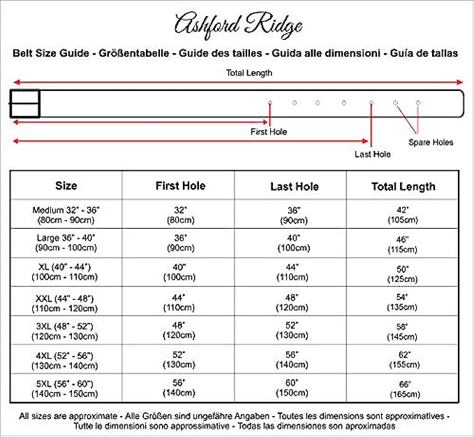 100% Leather belt closure Dry Cloth Clean Full Hide Leather - Made from full grain hide leather straight from the tannery to ensure you have a high quality, long lasting full leather belt. Unique - Being made of 100% full grain hide leather means that each belt with have its own beautifully unique natural markings. Each belt has then been buffed and edge finished by hand. Perfect Width - Being 34mm means that you can wear these belts with almost anything, they look stunning with suit trousers and just as good with jeans, chinos or casual trousers. Reassurance - Made by Ashford Ridge you can be assured that great care has been taken in crafting your 100% full hide leather belt, with over 40 years experience with belts and leather goods we know how to treat leather with the care and attention it deserves. All Colours/Sizes - Available in black, brown or tan and for waist sizes from 32" all the way up to 56".