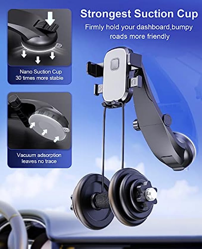• 【SAFE AND STABLE】The car cell phone holder is made from new upgraded suction cups, which provide stronger grip. So it will stay in place better and is friendly to your phone on bumpy roads during emergency braking and sharp turns. The inner clip of the upgraded phone car mount adds air capsule silicone, which increases the friction by 60%.
