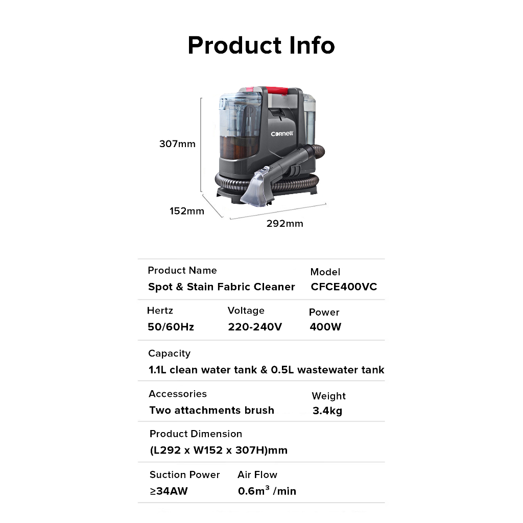 Cornell Spot and Stain Fabric Cleaner CFCE400VC Sofa, Mattress, Upholstery and Carpet Cleaner