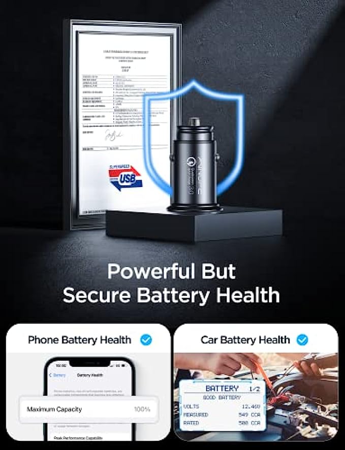 • OFFICIAL CERTIFICATION BY QUALCOMM: AINOPE is honored to be a 1% partner of Qualcomm official certification. Additionally, in Qualcomm's approved military-grade laboratory, this QC fast car charger passed testing for fast charging speed, device compatibility, battery health and friendliness, and charging heat dissipation. AINOPE will provide the same quick charging experience as the original charger.