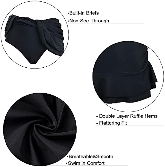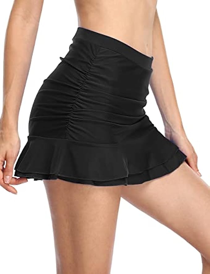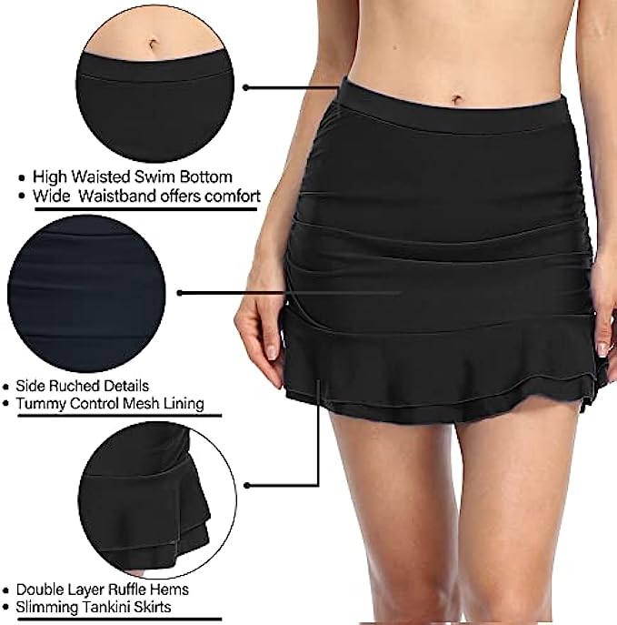80% Nylon, 20% Spandex Imported OUR SIZE SUGGESTION:The Swim Skirt fits true to size now, please refer to the size you normally wear. For example:If you are US 4, please order size 4, you will receive the swim skirt Tag US 8 which fit for US 4 (We make the adjustment). Swim skirt features built in swim pants and an elastic waistline for a flattering fit. Ruched front design and flat in back, so it can slim your tummy and flatter feminine curves. High waisted swim skirt for concealing tummy better; Double ruffle hemline. Built-in mesh brief increases comfort and support.