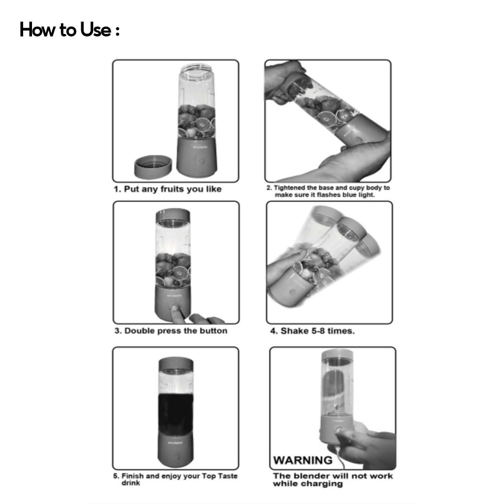 Hyundai Portable Fruit Blender Portable Extractor Blender Usb Rechargeable 4 Blades 400ml