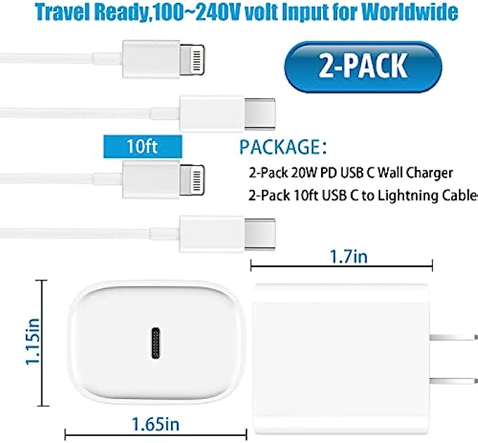 • 【Hassle-Free Service】2pack iPhone charger block + 2pack MFi Certified Long Charger Lightning cable (10Ft).We will provide a 12-month worry-free warranty friendly customer service.Please don’t hesitate to contact us and we promise to solve your problems within 24 hours