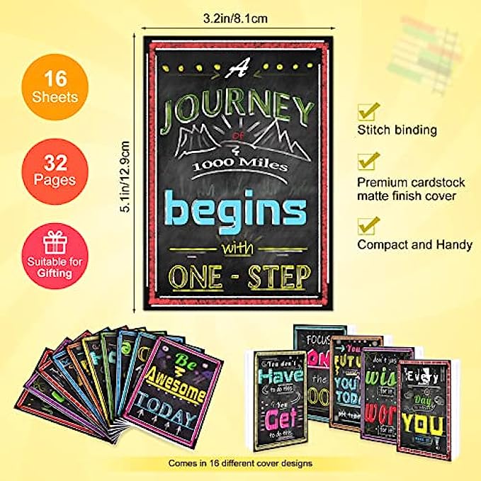 • 16 Motivational Notebooks - We have 16 different beautiful exquisite designs, our Notepads are bold, unique, and easy to read with their focused growth mindset slogan and eye-catching image. Each Mini notebook size measures approx. 3.2 x 5.1 inches, and has 16 sheets with 32 pages and 14 lines on every page. Pocket convenient too
