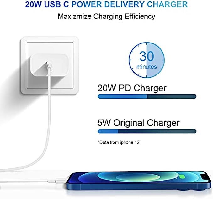 • 【Unrivaled Speed】- iPhone Fast Charger equipped with 20W PD 3.0 USB Type C power delivery wall plug, PD 3.0 Quick-Charge USB C port provides Max 20W output power, charge your device up to 3x faster than original 5W charger,charging your iPhone 13 up to 50% in just 30 minutes, saving over 1.5hrs for you.