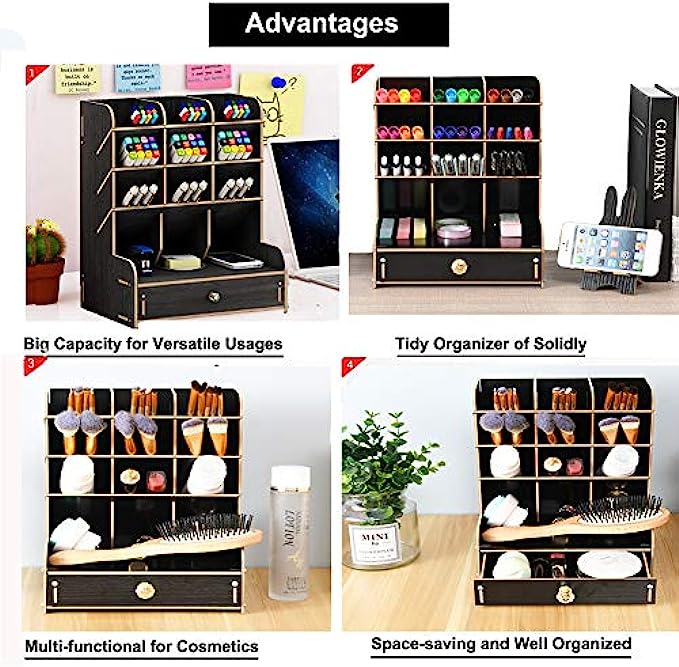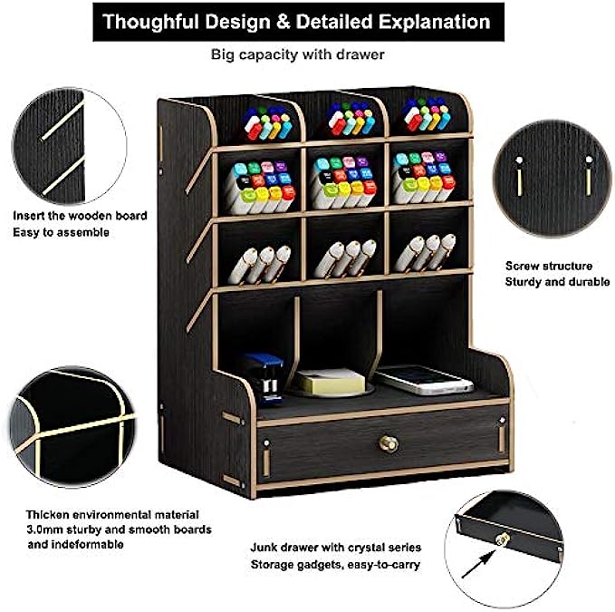 • ✎【CREATIVE DIY DESIGN】: This Desktop organizer needs to be assembled By Yourself, it's full of the joy when you assemble the desktop organizer . Installation according to the instructions or video is very simple ,made up of 15 boards to assemble,fix it with screws. A single man can easily assembly it within 20 minutes. Instantly turn it into an eye-catching stationary.