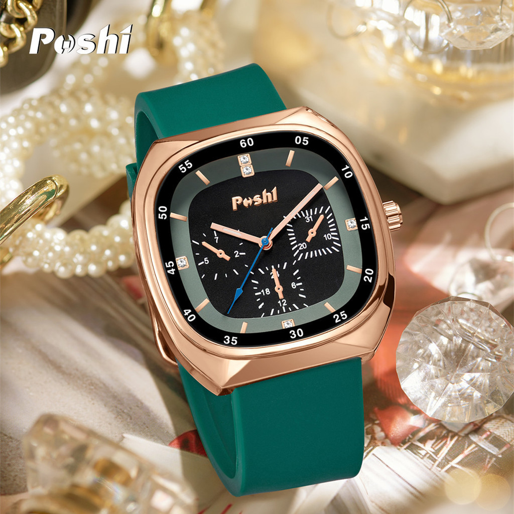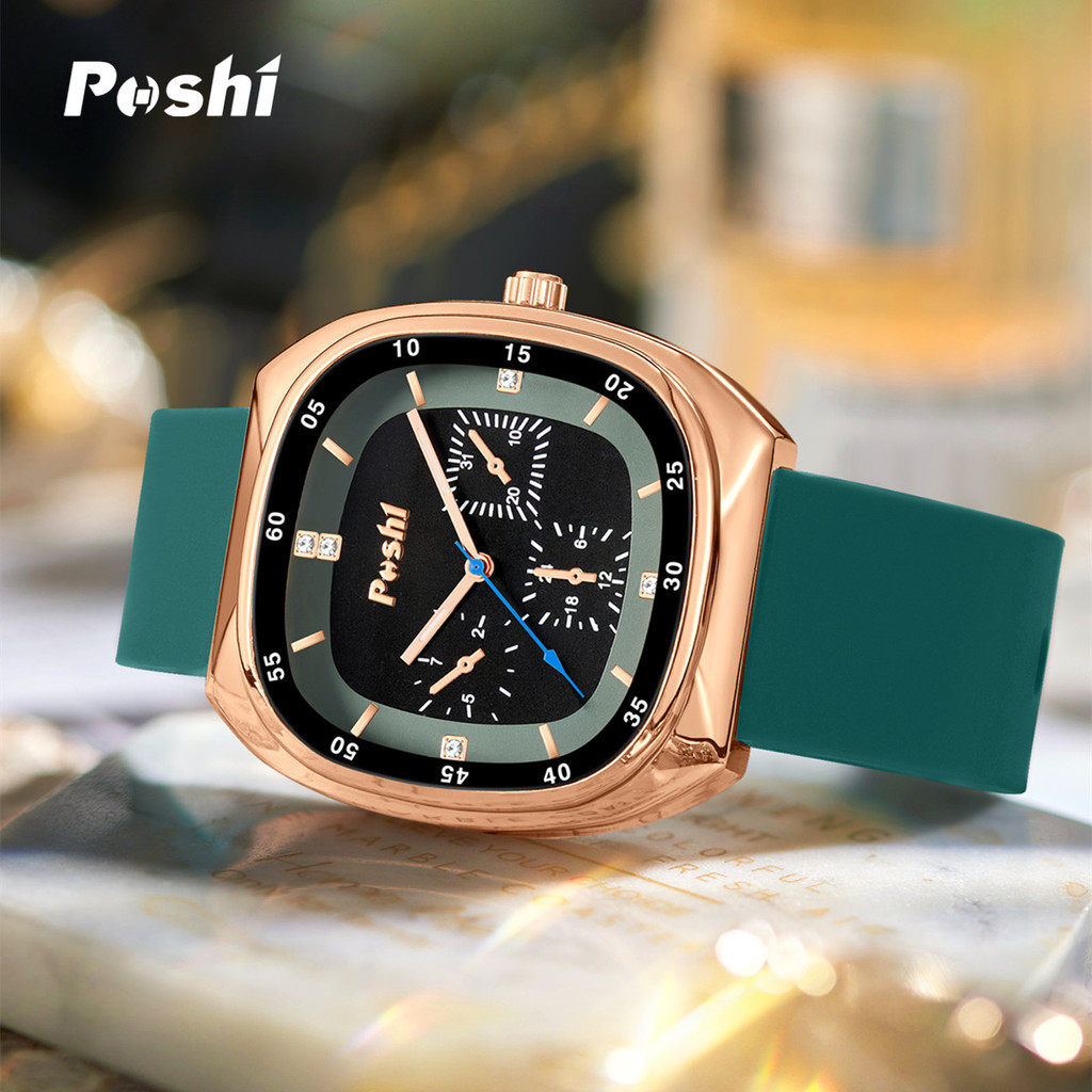 Poshi Waterproof Fashion Korean Quartz Women's Watch Square Dial Genuine Silicone Strap Elegant Watch