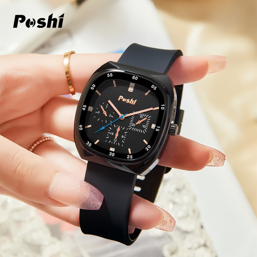 Poshi Waterproof Fashion Korean Quartz Women's Watch Square Dial Genuine Silicone Strap Elegant Watch