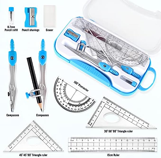 • 10 Pcs Math Geometry Set: 2 Metal Study Compasses, 2 Triangles (45° & 30°/60°), 6" Ruler, 4" Protractor, Pencil for Compass, Pencil Sharpener, Eraser, Pencil Lead Refill