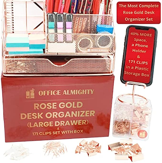 THE MOST COMPREHENSIVE DESK ORGANIZER SET: 40% Larger Rose Gold Desk Organizer paired w/ BONUS 171 Clips Set: 6 Pcs Large Binder Clips, 15 Pcs Small Binder Clips, 100 Pcs Paper Clips, 50 Pcs Push Pins; Stored in a reusable clear acrylic box to keep these clips accessible and organized; Also, an Ergonomic Design Phone Holder provides a perfect viewing angle with an extra-large base; All packed in an elegantly designed gift box; A perfect gift idea to anyone who works in an office and home!