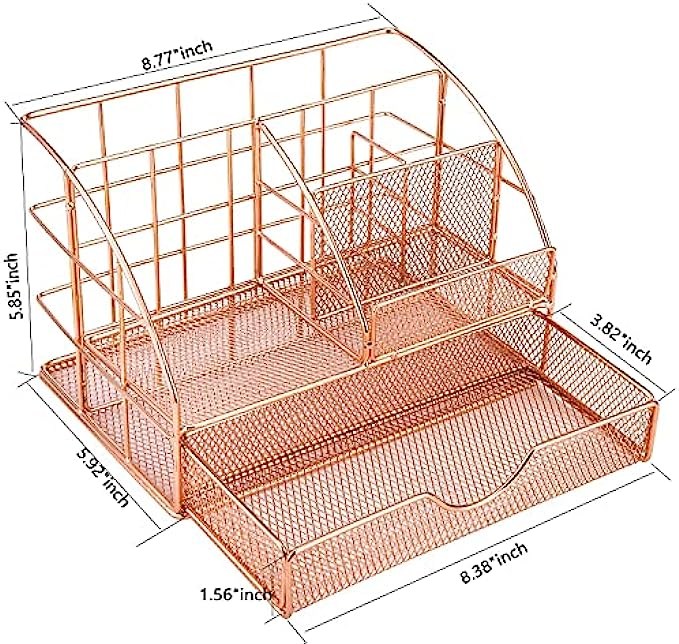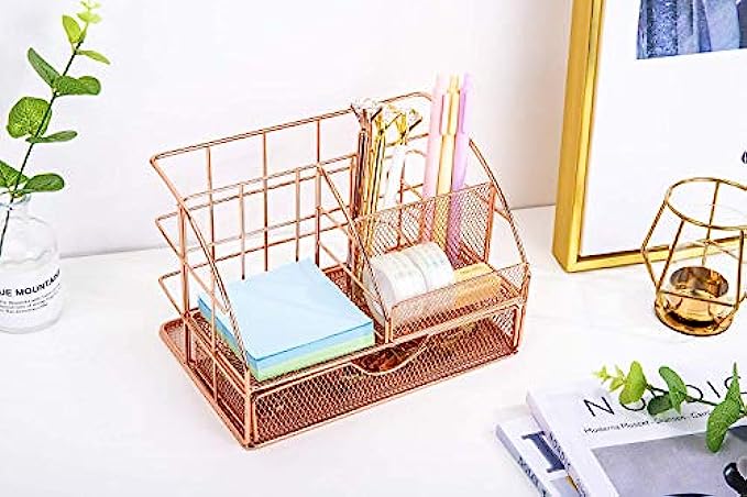 【SHINY & STURDY CONSTRUCTION】:Adopting premium electroplating technology to make the construction of desk organizer much sturdier and reliable.what's more,rose metal finish design show the appearance more elegant and durable use than other mesh or plastic organizer.