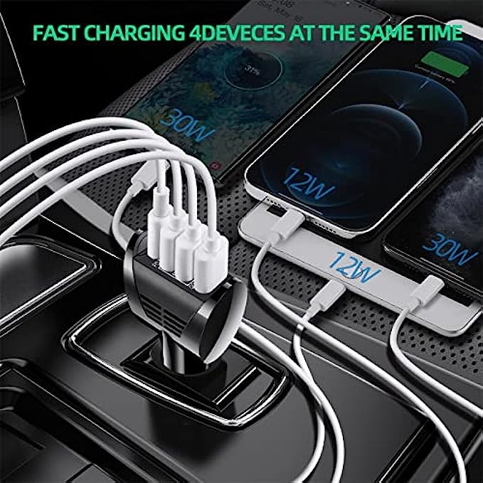 4 USB car charger is wide compatibility, compatible with iPhone series, iPhone 13 12 11 Pro Max X Xr 8 Plus SE2 iPad Pro, Samsung Galaxy series, Galaxy S21 S20 Ultra 5G S10 Note 20 10 A70 A50, Pixel Nexus, LG, Huawei, tablets etc.