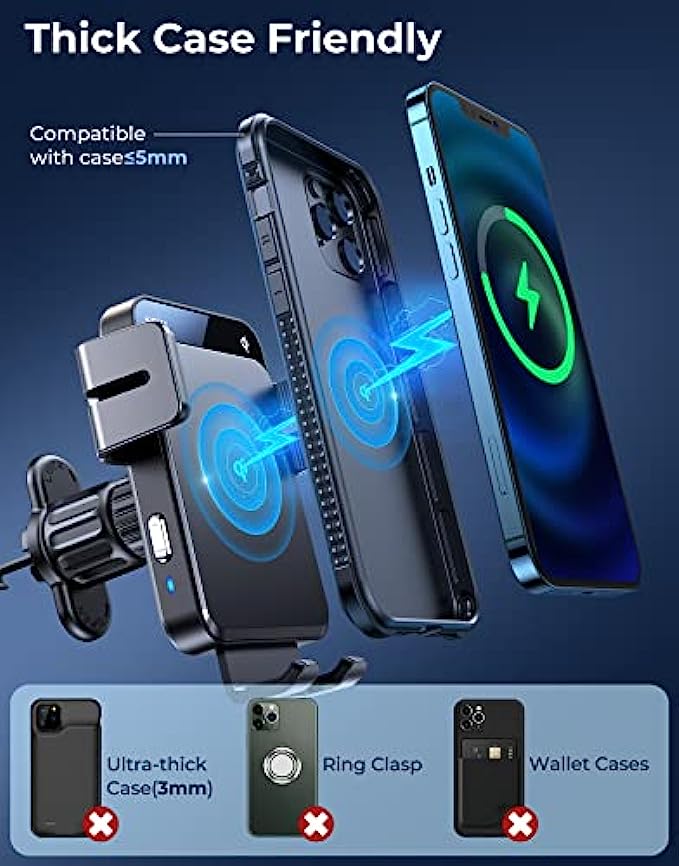 • ? 【Flexible Angle & Case Friendly】 With a retractable & foldable bracket and 360° rotatable head, it never blocks your driving sight, you can adjust it to a position that makes you comfortable. Joyroom car mounts wireless charger supports charging through phone cases up to 5mm thick. Please note that cases made of metal, external attachments such as magnets, credit cards, grips, and stands will interfere with charging.